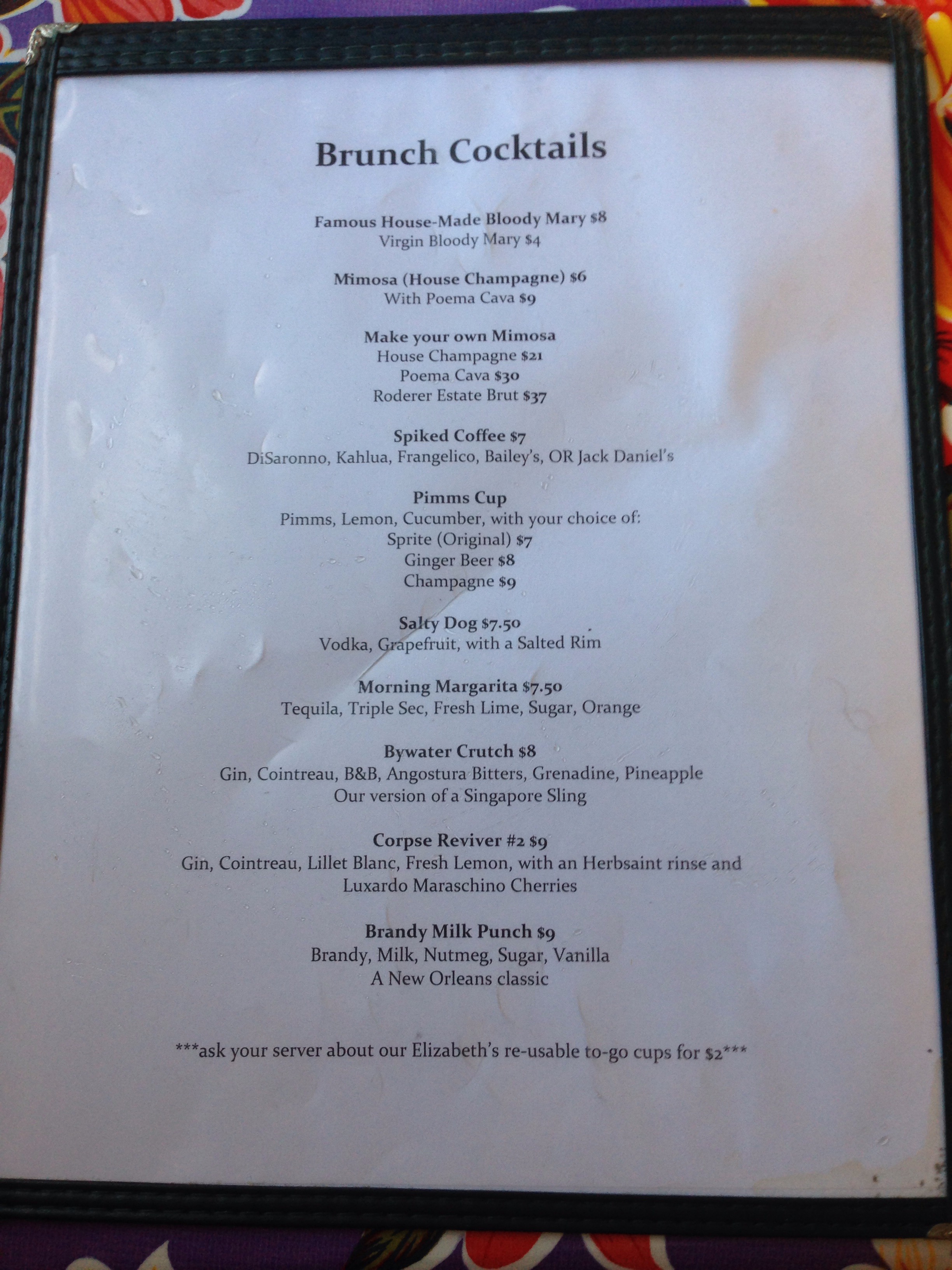The variety of items on Elizabeth’s standard brunch menu makes choosing your meal a difficult task. But wait! The specials on the chalkboard make choosing even harder!