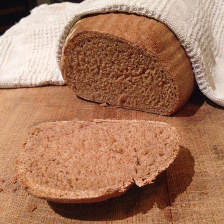 I didn’t need to be eating so close to midnight, but I couldn’t go to bed without tasting the bread right out of the oven (with some butter of course). The bread had a rich, earthy and full flavor and a dense texture. The texture would probably be lighter if I let similar loaves rise in the future. I feel like I am developing a deeper knowledge of my two starters with this latest attempt with each feeding and the type of flour used to feed the starters. Next time, I will allow the whole wheat sourdough to rise a little longer.