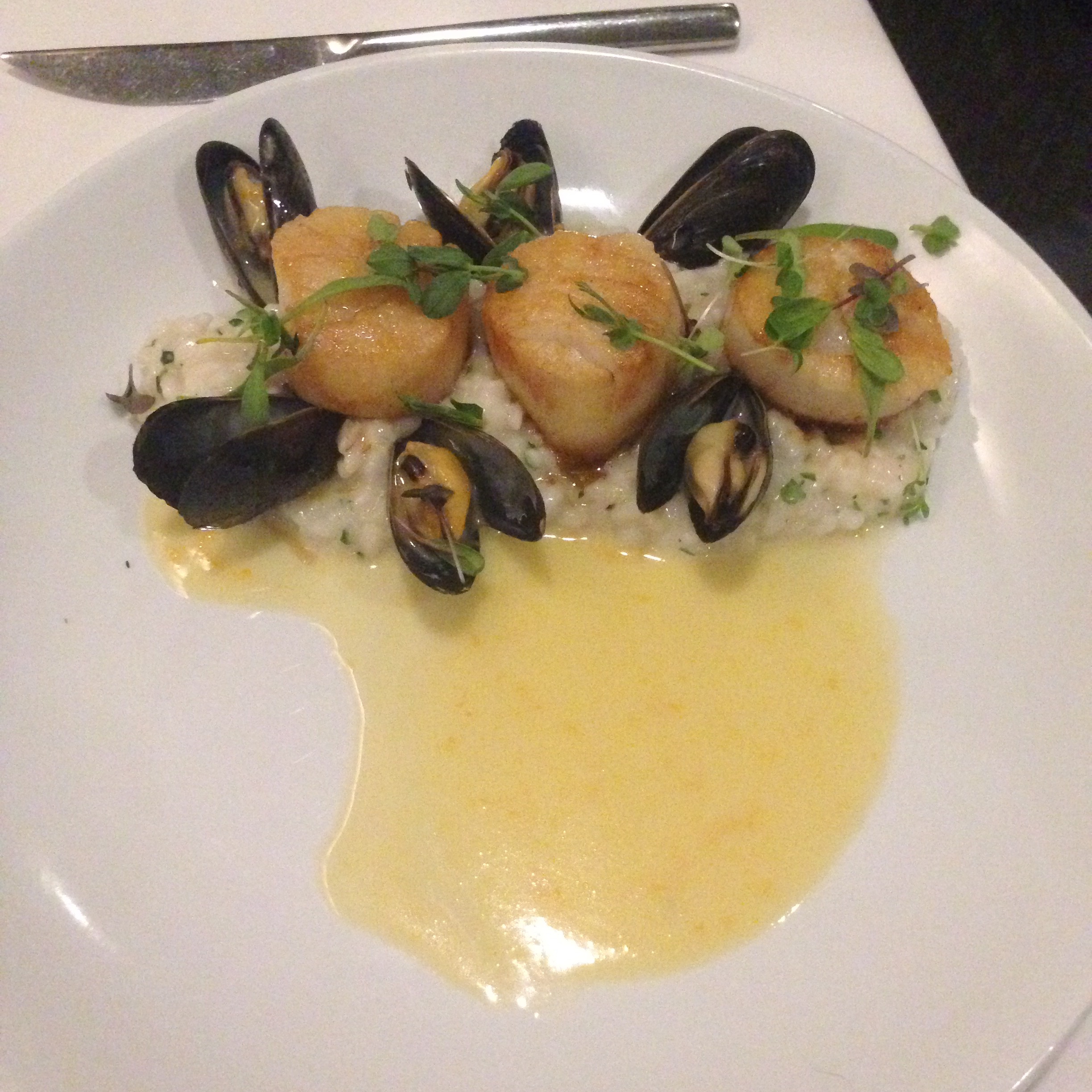 My glass of Malbec arrived as we finished our first course. Paul ordered a glass of Cakebread Chardonnay to accompany his entrée. Our next course arrived a few minutes later but without Paul’s Chardonnay. He waited patiently for his wine so that he could enjoy it with the scallops. The pairing was worth the wait. The scallops and mussels were perfectly cooked and served with a rich beurre blanc subtly flavored with tangerine. The herbed risotto was creamy, a bit overly so, but good texture and flavor. ⭐️⭐️⭐️1/2