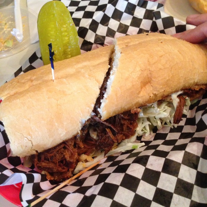 The menu at Elwood’s Shack in East Memphis (enter from Lowe’s Parking lot) is large and overwhelming and you won’t find the Debris Po’boy on it. Don’t panic. The KING of sandwiches is listed on a specials board next to the cash register. We knew that one of us would be ordering the Debris Po’boy but also wanted to try some other items on the menu. We saw many great sandwiches, pizzas and tacos coming out of the kitchen. After the Po’boy, we ordered a Spicy Italian Sub, the Maytag Bleu Cheese and Jalapeño Cole Slaw and the Tater Salad.