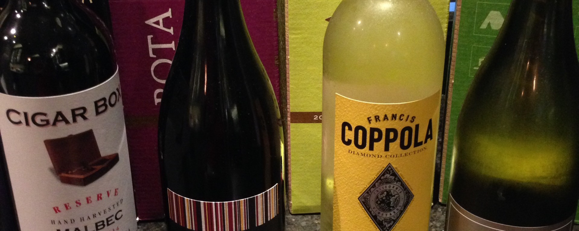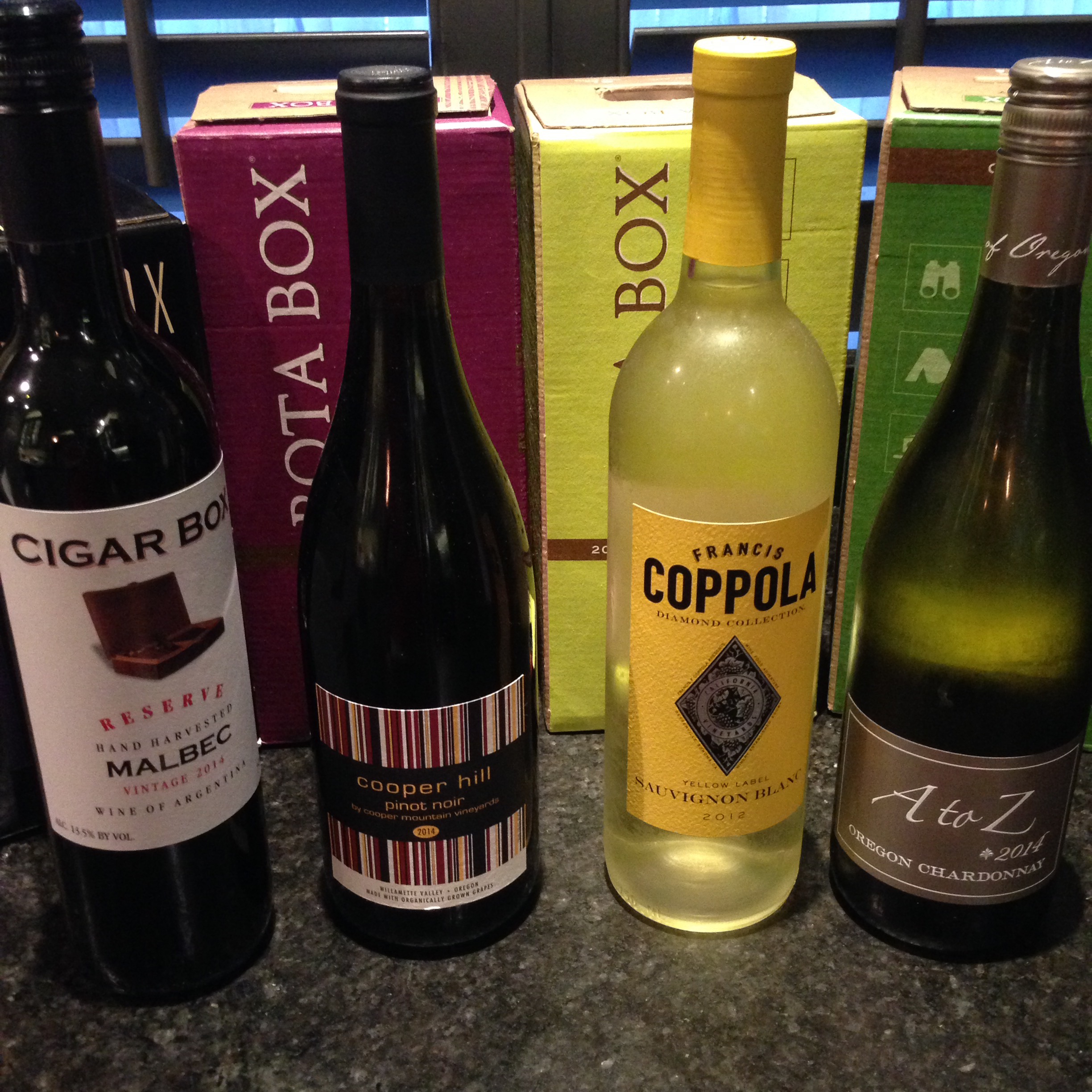 Paul brought Francis Coppola Diamond Collection Yellow Label 2012 Sauvignon Blanc (US $12.99) from California, A to Z 2014 Oregon Chardonnay (US $12.99), Cooper Hill 2014 Pinot Noir from the Willamette Valley in Oregon (US $14.69-19.99) and Cigar Box Reserve 2014 Malbec from Argentina (US $8.29-19.99). For the most part, we controlled for price for both boxed and bottled wines. Allowing high-end bottled wines in this experiment would have introduced an extraneous variable likely to skew the results.
