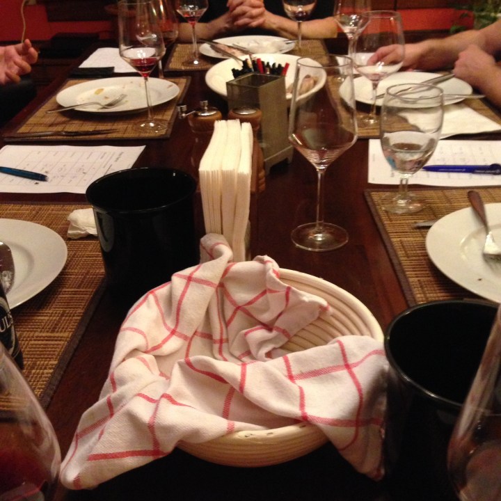 The white wines chilled in the refrigerator and the red wines allowed to come to room temperature before serving. Paul poured our wine into glasses in the kitchen and brought them for us to taste in the dining room so that we could not see from where the wine was poured. Paul also mixed up the order for each varietal: sometimes he would give us the boxed wine first, the bottled second or vice versa. I created a simple review sheet for our small wine tasting group of 4 people: Miguel, BJ, Jon John and myself. While I am at least 10 years older than other members of the rest of the group and count 12 years experience drinking wine in tasting groups, I still consider myself an amateur when it comes to a palate for wine. None of us are potential sommeliers. For each varietal, we made our best guess on which wine was from a bottle or a box. None of us shared individual criteria for determining bottle or box until after the tasting.