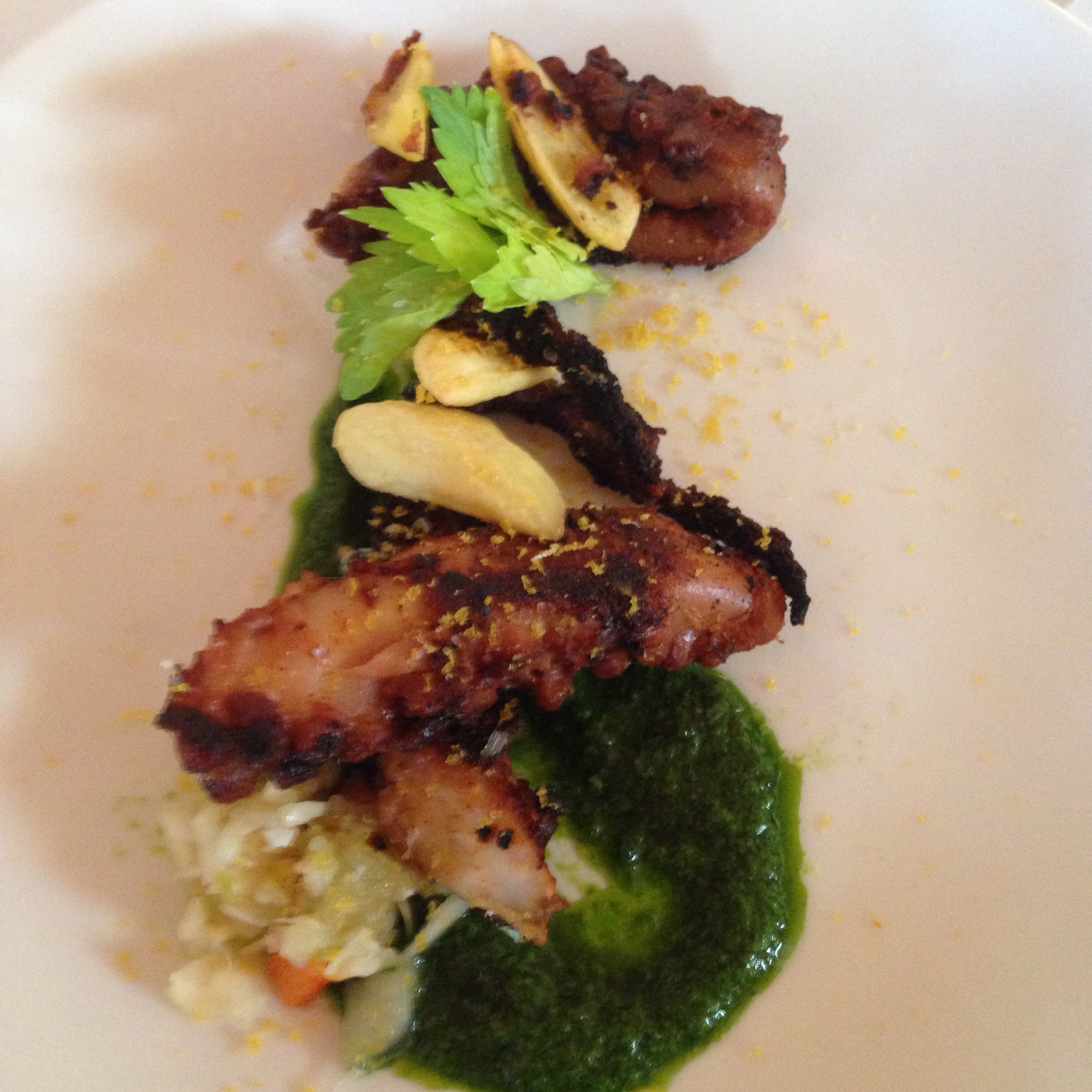 Before the main course, we began to feel warm in the dining room and noticed all the wait staff “glowed” as we say in the South. Apparently, our seltzer water bearer informed that the HVAC system was scheduled to be fixed the next day. Rebecca ordered the salad from the specials chalkboard, Eric choose the Pan-Roasted Pompono Sandwich also from the specials menu, Paul decided on the Griddled Octopus from the main menu, and I asked for the appetizer specious the chalkboard.