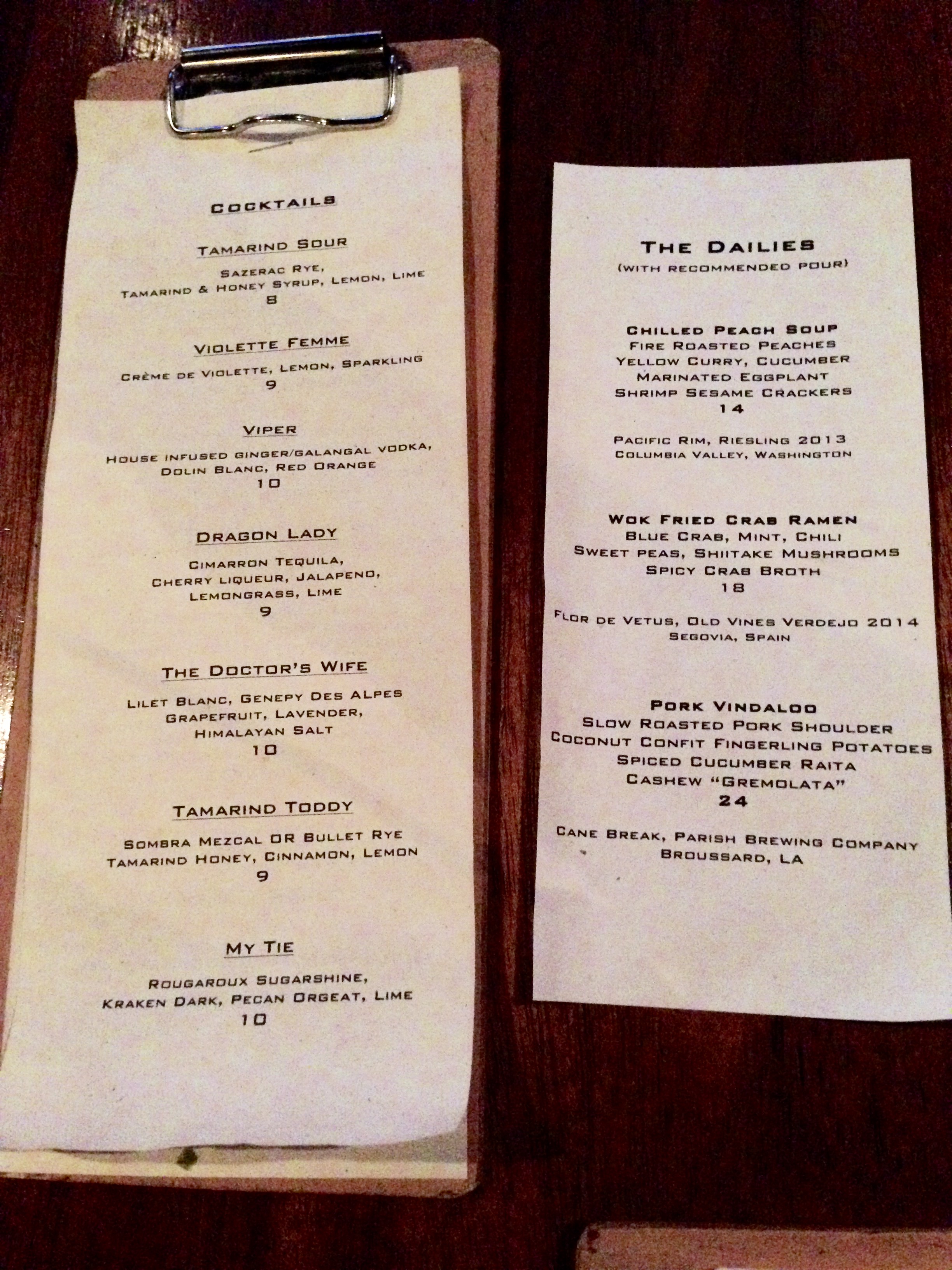 We received a table inside and beside a view of a patio lit with strings of low-watt bulbs and shaded by sheets of fabric radiating from a center pole over stained wood picnic tables — a great place to dine had rain and warm temperatures not been in the forecast. Our server provided a main menu along with cocktail, specials and Boba Tea menus. Cocktails and teas contain the spices and flavors of southeast Asia with clever names like “Violette Femme,” “My Tie” and “Assaulted Caramel.” We could tell from the variety of dishes that we’d need some help making decisions. Our server obliged with detailed answers to questions along with advice on personal and off-menu favorites.