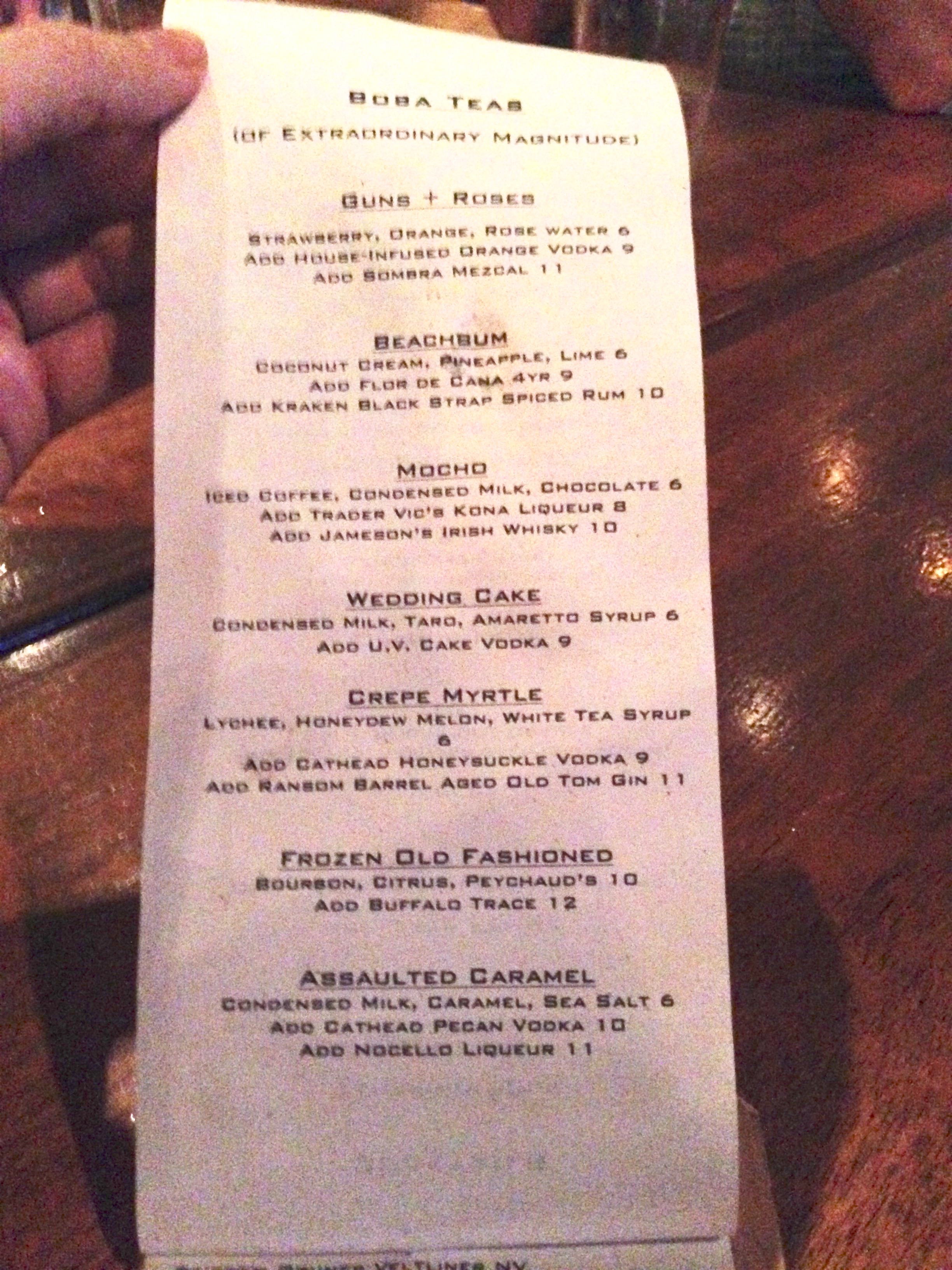 For dessert, we shared the Ginger and Lemongrass Ice Cream Sandwich with lemon balm and citrus salad and a glass of the Assaulted Caramel Boba Tea. The ice cream (⭐️⭐️⭐️) was tasty but I favored the Boba Tea with condensed milk, caramel, sea salt, and cathead pecan vodka served with a fat straw so that you could draw up the green pea-sized tapioca to your mouth (⭐️⭐️⭐️⭐️).