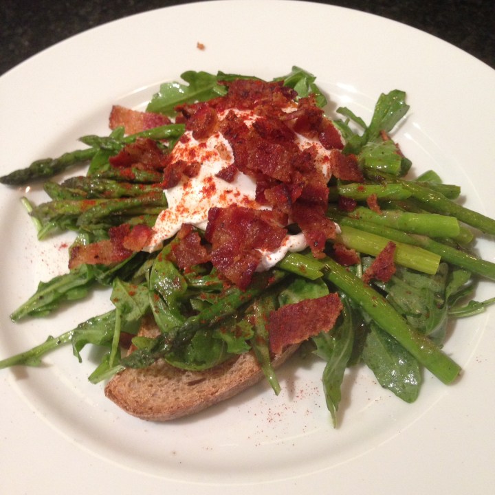 This recipe combines ingredients from an ABE Sandwich (asparagus, bacon and egg sandwich) and a simple French salad. I didn’t find fresh tarragon at the store, so I left it out of my salad dressing. Any spring greens or Bibb lettuce could easily substitute for the arugula in this recipe.