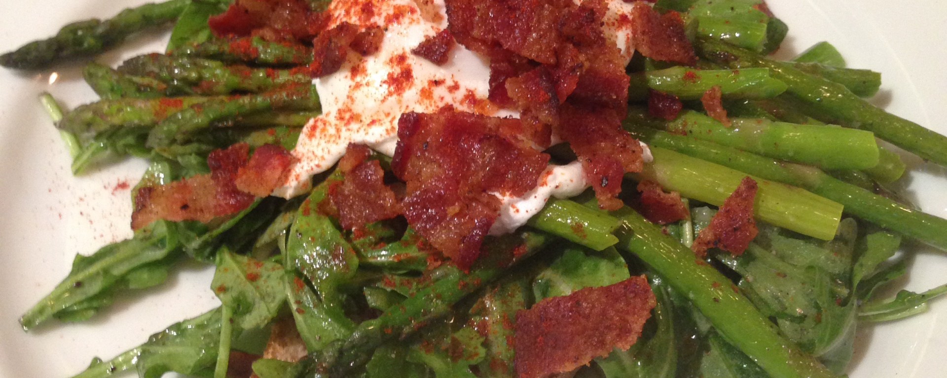 Poached Egg Salad with Asparagus, Bacon and Arugula