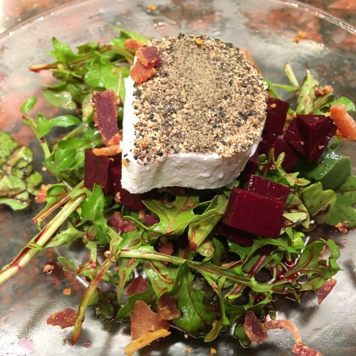 The Balvenie Doublewood 17 from Speyside tastes like allspice and vanilla on the palate and finishes with notes of vanilla and honey. We paired this Scotch with sweetened beets poached in Balsamic vinegar and red wine, creamy goat cheese encrusted with black pepper, peppery arugula and hickory smoked bacon.