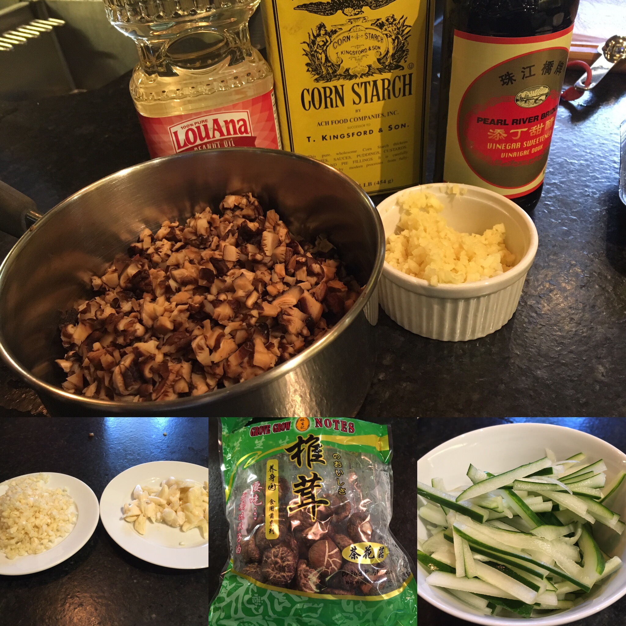 - Bring 1 tbsp of peanut oil to high heat in wok. Add pork. Stir and and cook until pork begins to golden. Add ginger and garlic. Stir and cook for 2-3 minutes. Add drained mushrooms, stir and cook for about 2-3 minutes.