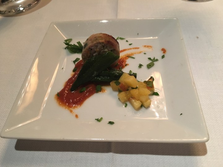 The first course included flutes of a Crémant du Jura and amuse bouche of roasted tomato and pork sausage.