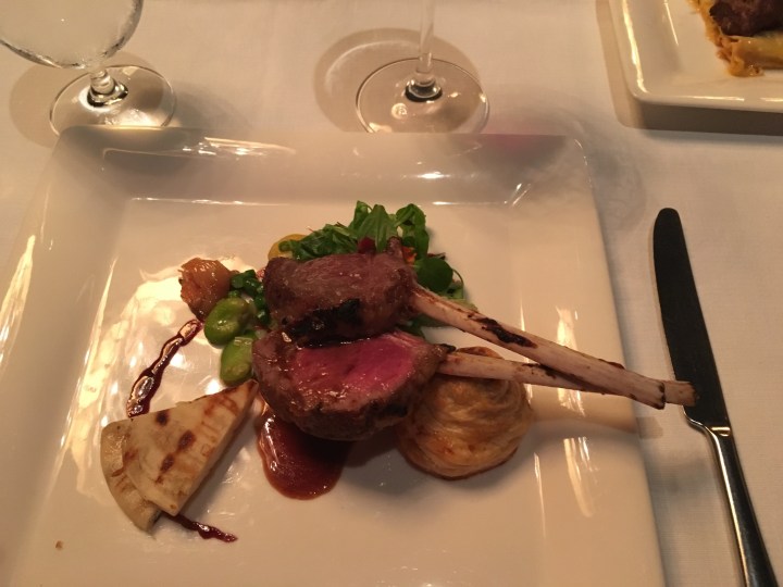 For the third course, the kitchen sent veal tenderloin, white lasagna, and tomato gel with a 2008 Clos del Rey for the first plate. The thin layer of lasagna with delicate fresh pasta beautifully complemented the tenderloin. The second plate presented a classic preparation of rack of lamb, marsala reduction, and sweet potato maple pie with a 2012 Buil + Gine, Joan Giné.