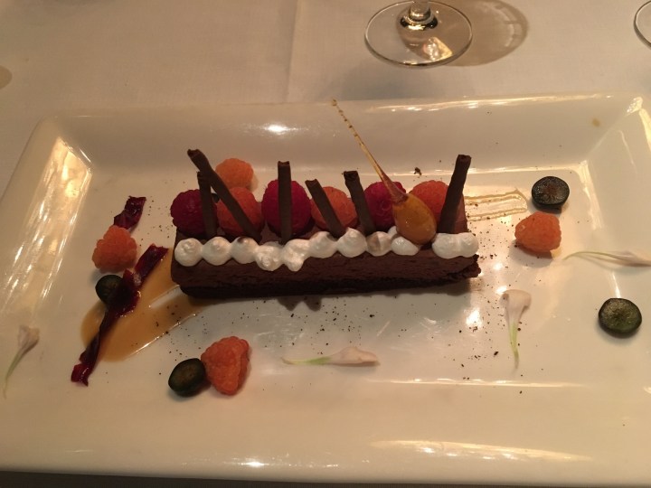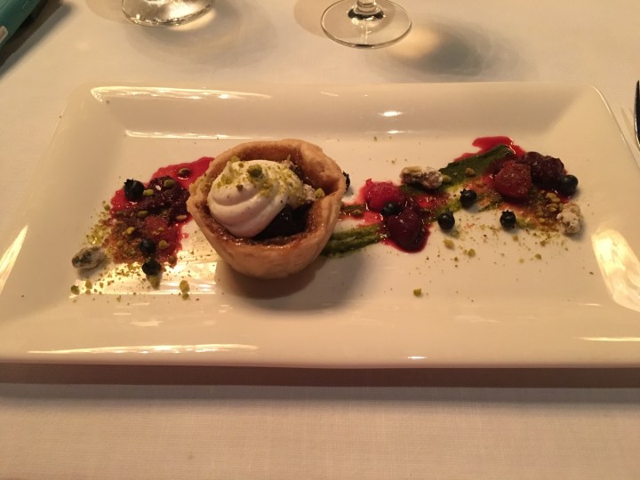 For dessert, the kitchen sent a chocolate mousse paired with a delicious 1986 Toro Albala Pedro Ximénez which spent at least 20 years aging in a barrel. The mousse was tasty but the sweet PX dominated this dessert. The second dessert featured fruity and flaky cherry tart with an unusual varietal for ice wine – a 2014 Tawse, Cabernet Sauvignon.