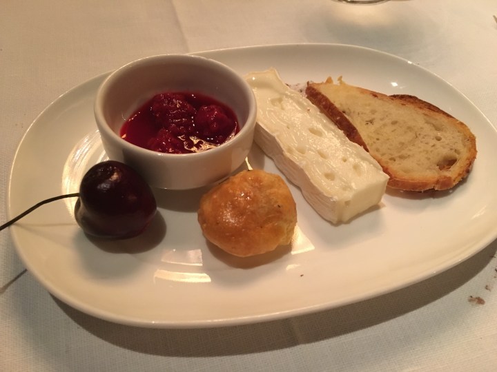 Our servers brought dessert to us right after the sommelier poured the wines for our cheese course, but our sommelier caught the error before we commenced with dessert. The snafu delayed the arrival of our cheese course which called attention to Quebec producers: La Madeleine Sheep Cheese, Quebec paired with a 2015 Dr. Bürklin-Wolf Wachenheimer Riesling, Auslese and a lovely and sticky Le Pied-De-Vent Cow Cheese with former Parisian sommelier Eric Bordelet's Poiré Authentique (pear wine!). Parmesan puff, baguette toast points and fresh raspberry jam accompanied both cheeses.