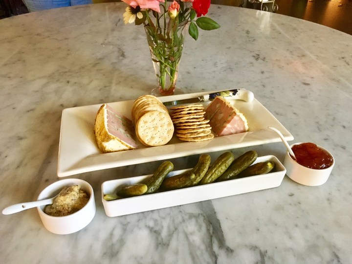 After trying traditional pâté accompaniments of toast points, cornichons, and whole grain Dijon mustard served with the torta, my friend Kim and I agreed that a sweet hot pepper jelly would really contrast well with savory cake (later confirmed in a later serving of the torta!). The spicy flavor of the torta’s internal icing layers gives a good punchy contrast to the mild mortadella and creamy mascarpone on the outside.