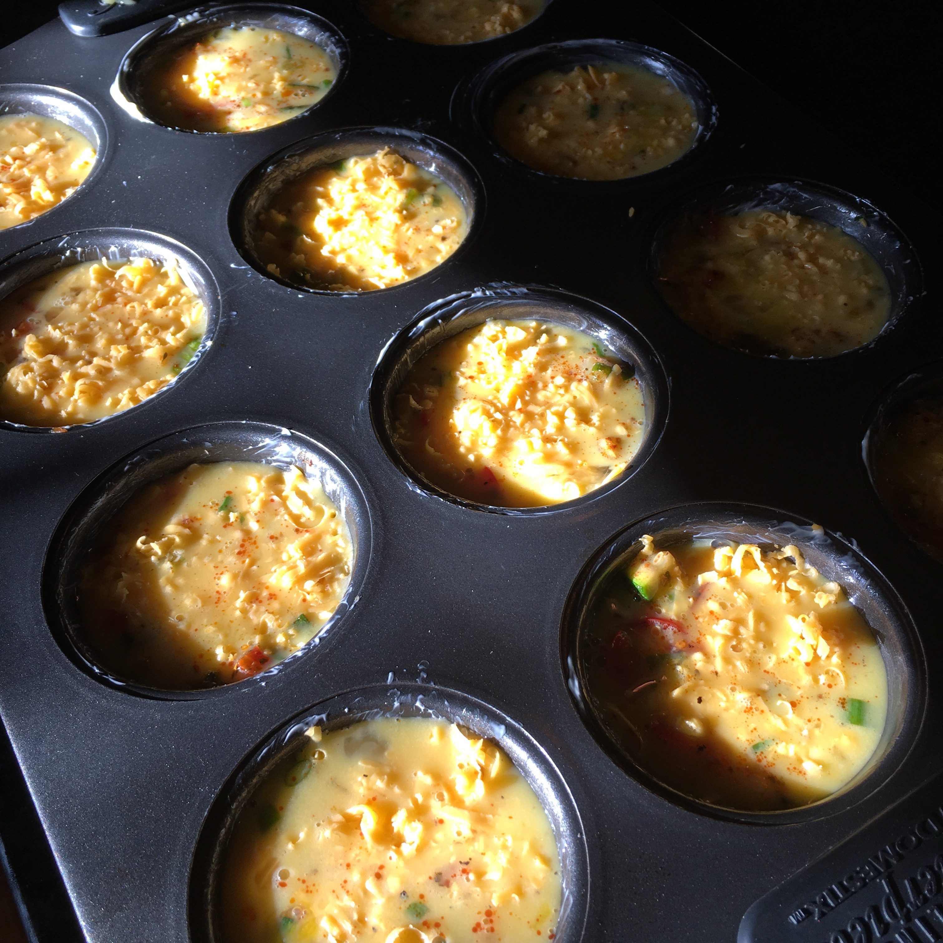 - Spoon equal portions of vegetables into each muffin cup followed by equal portions of shredded cheese. Pour egg 3/4 of the way up each cup (any higher and the eggs will spill onto the planar surface of the tin and make a mess as they rise). Gently stir the cheese and veggies to submerge beneath the surface of the egg mixture. Sprinkle a dash of paprika over each cup for color.