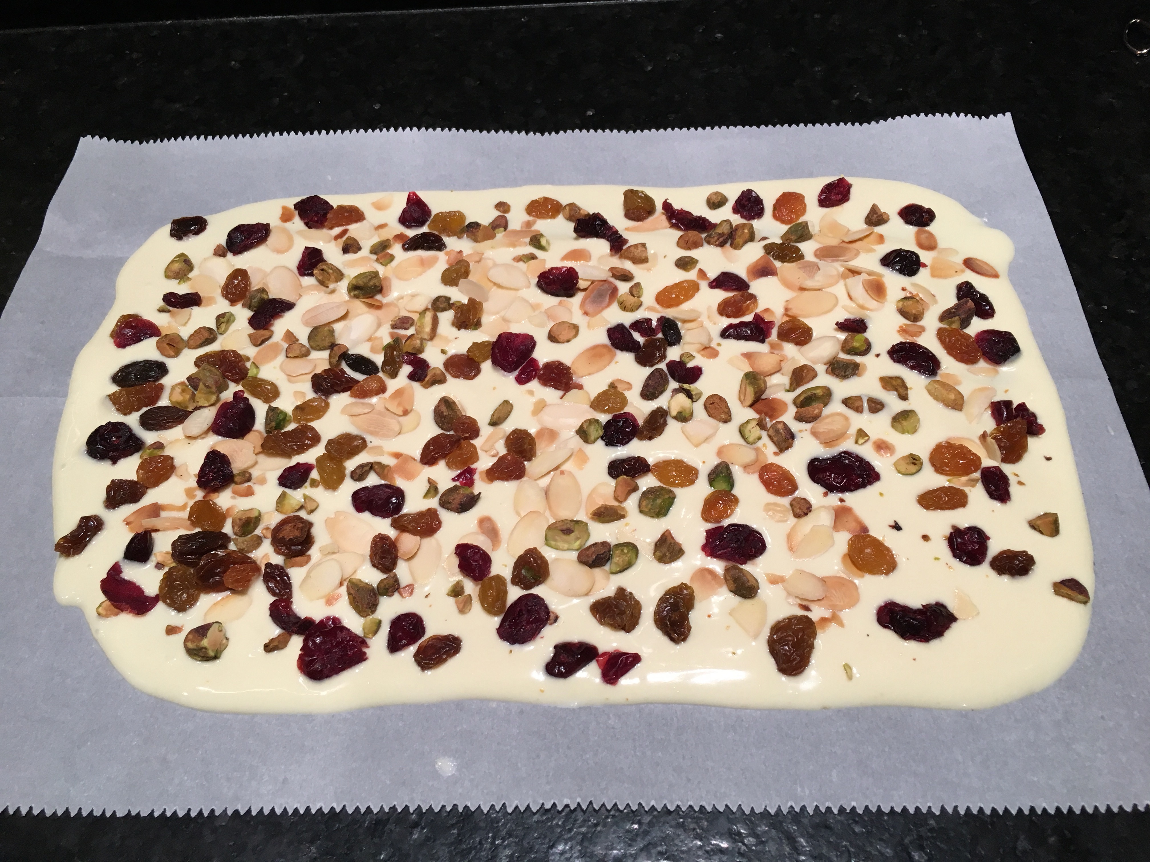 - Evenly spread the almonds, craisins, raisins and pistachios over the surface of the chocolate. Place cookie sheet into the refrigerator for at least 1 hour.