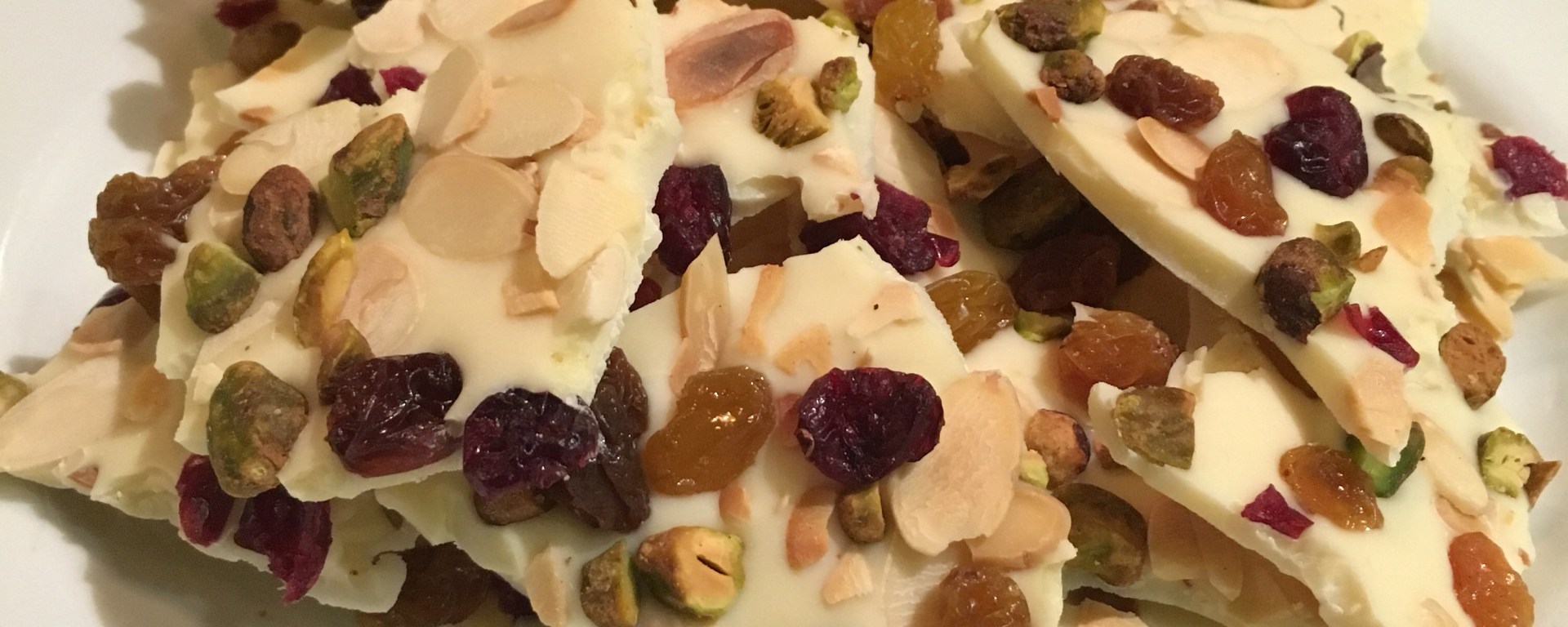 - Evenly spread the almonds, craisins, raisins and pistachios over the surface of the chocolate. Place cookie sheet into the refrigerator for at least 1 hour.