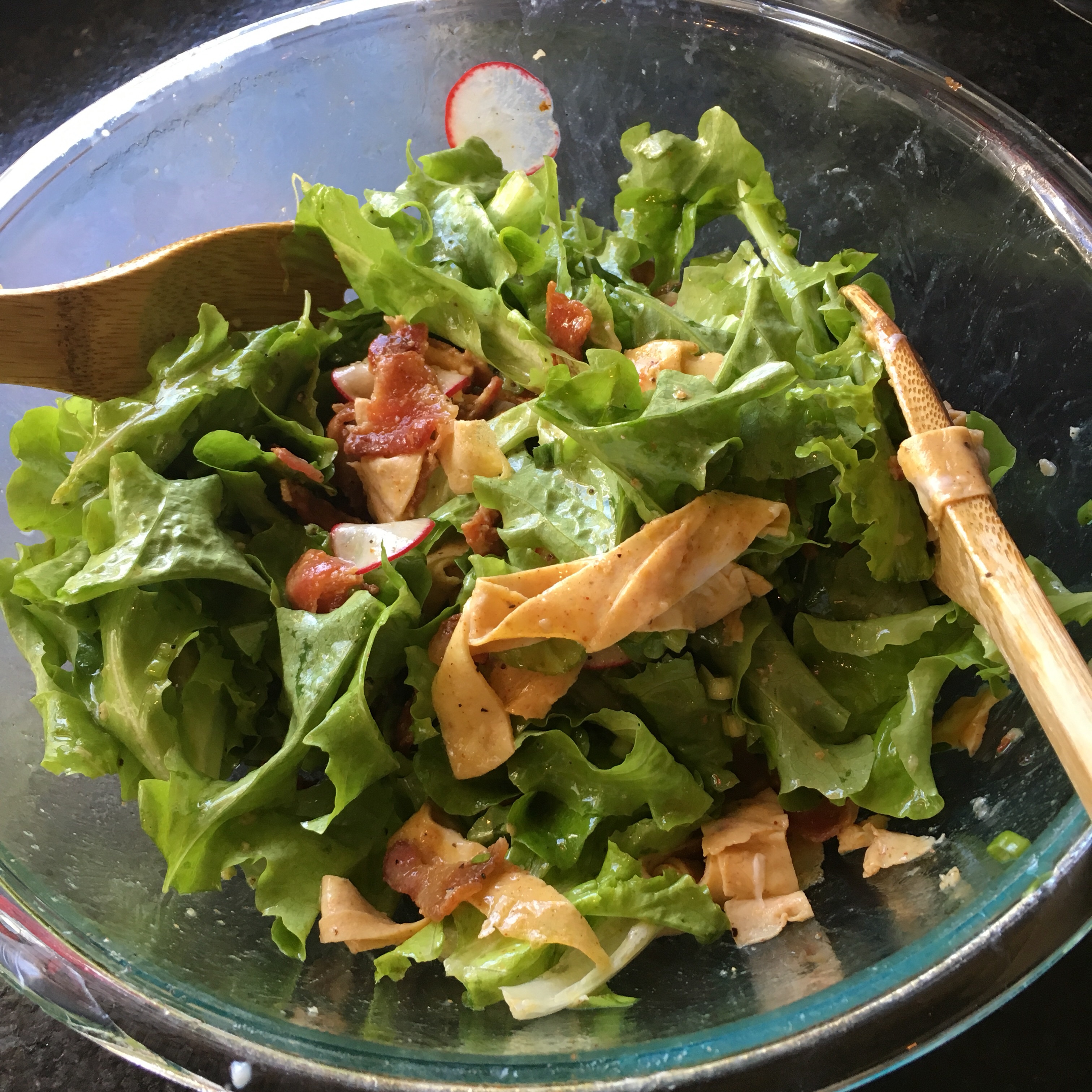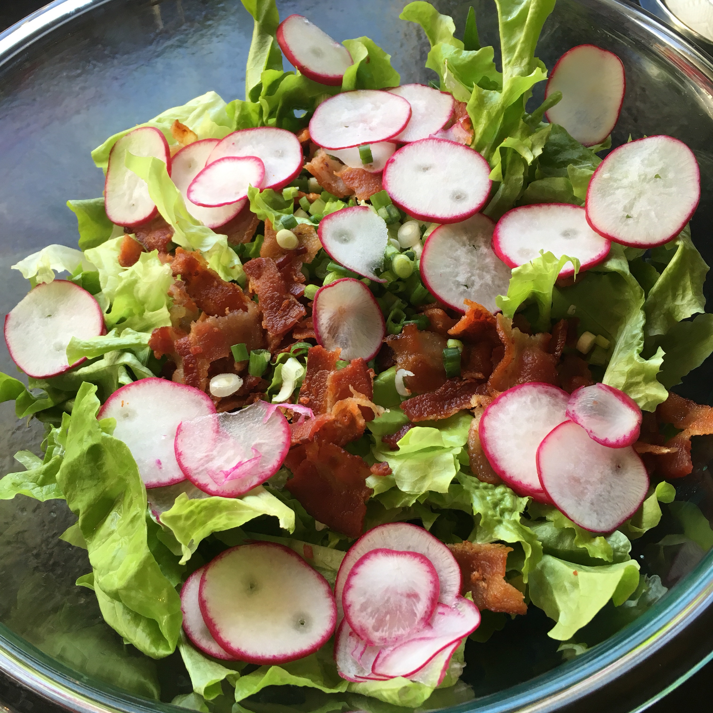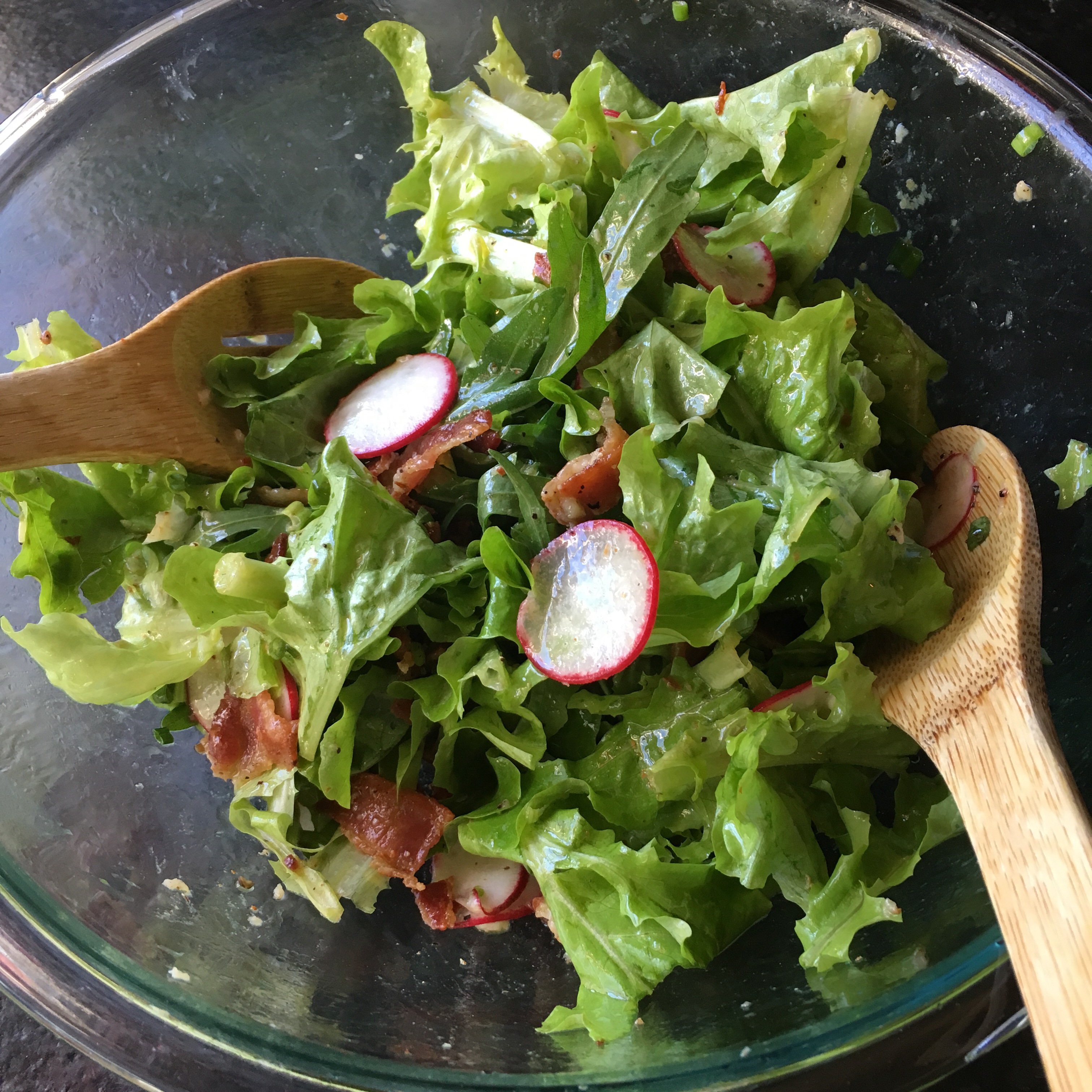 - Re-whisk dressing in bowl. Toss in lettuce, lettuce, radish, scallions, and bacon until mixed thoroughly.