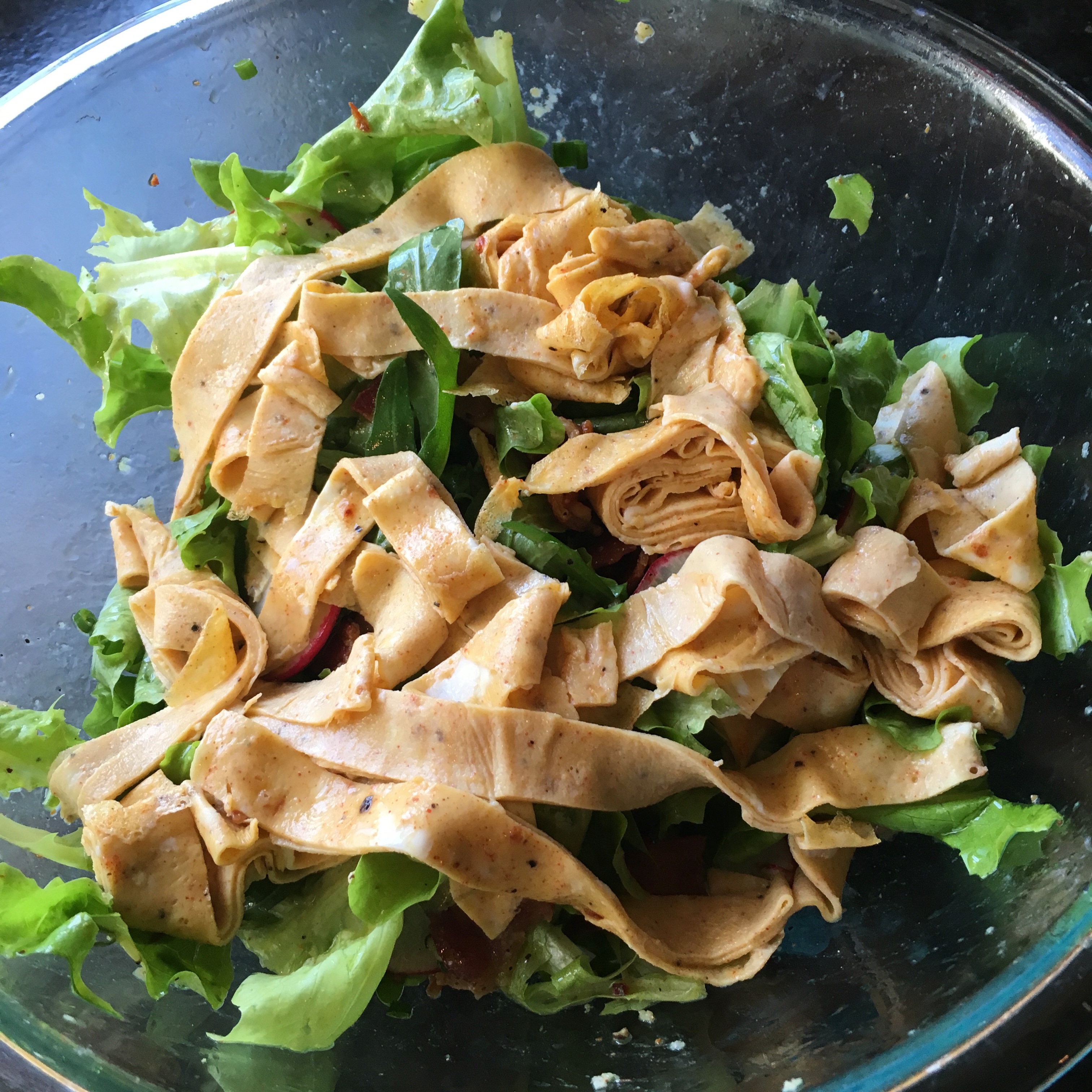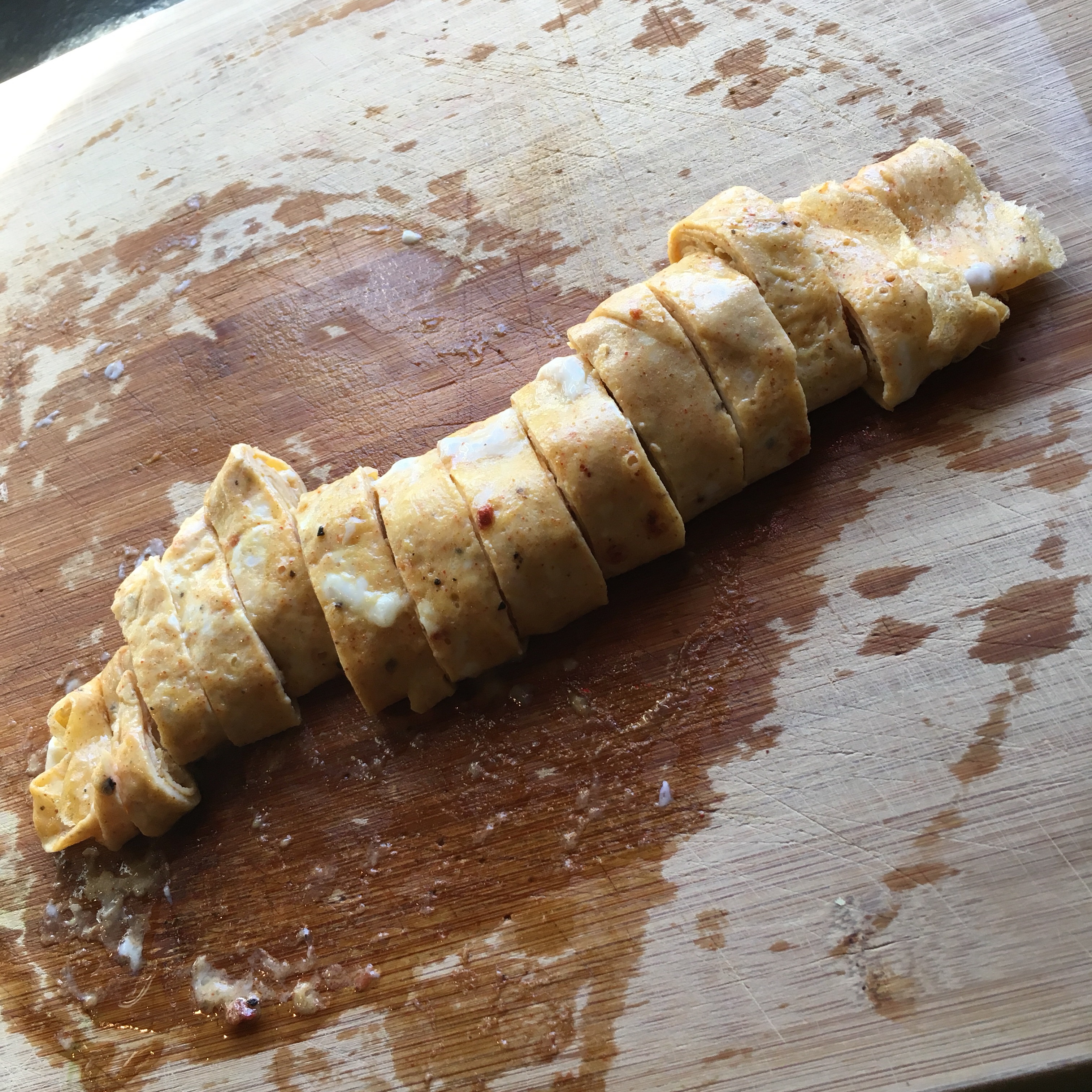 - Return to cutting board. Gently roll all three crepes as tightly as you can from one edge to the other edge. Slice rolled egg crepes into half-inch ribbons. Gently unroll the ribbons into the salad bowl and toss into greens with your bare hands.