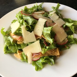 - Gently place tossed salad onto chilled plates. Add shaved parmesan to each plate and serve with a chardonnay or champagne.