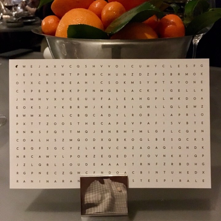 We arrived at a table for four decorated with oranges and clementines in a bowl chilled at its base, along with a mysterious word search puzzle on a stand. Our table staff confirmed my initial speculation that the puzzle contained the menu for the evening (Spoiler Alert: the solved puzzle appears at the end of this post).