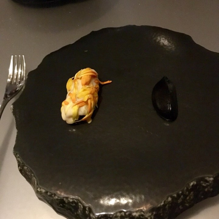 Served on another plate with the olives, a gel of garlicky black squid ink and a creamy bite of tender squid meat in cream that left us craving a savory bowlful of squid. The sommelier paired a Viñátigo, Gual with this savory dish — a white wine varietal from the Canary Islands (2016) which reminded us of the first time we enjoyed a Canary Island red wine varietal in the summer of 2017 at George in Toronto.