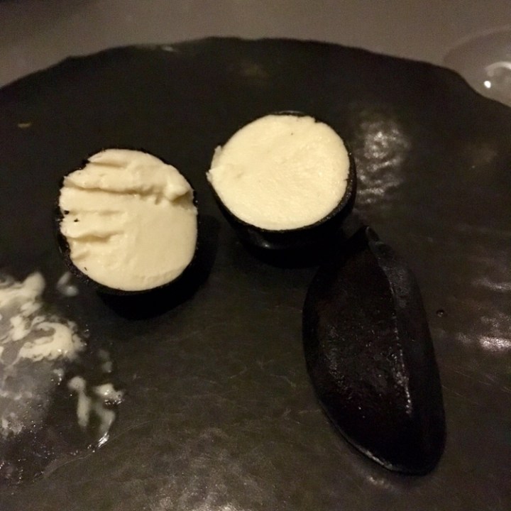 Nothing appears as it you expect at Alinea. A dark tray of shiny black rocks smoothed in a river bed obscured four black “olives” filled with rich artichoke cream in the molecular tradition of the old elBulli by Ferran Adriá.