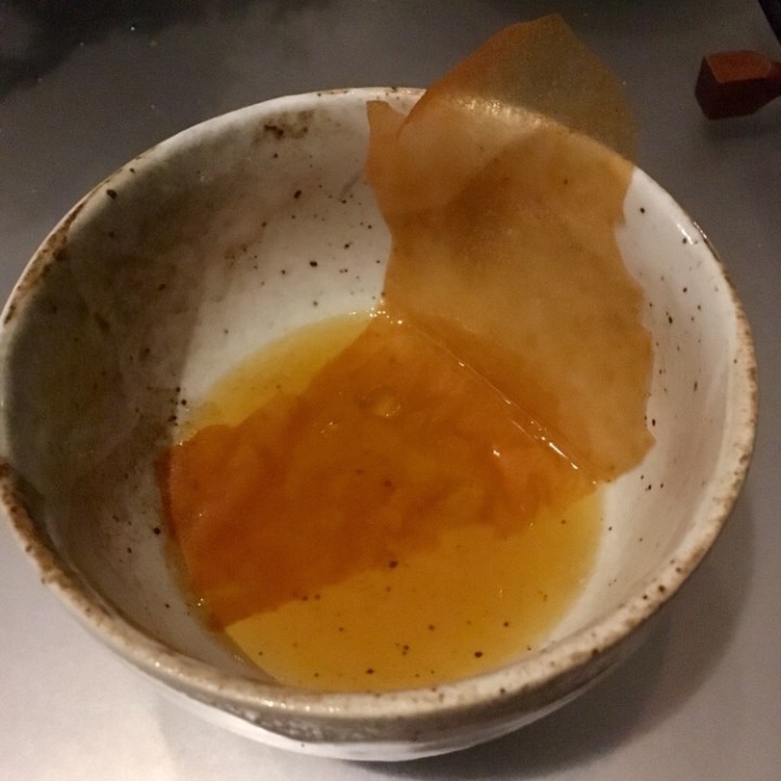 We shredded a thin sheet of “paper” made with shrimp with chop sticks in a bowl of savory broth and took turns sipping from the bowl and a glass of Benjamin Leroux, Puligny—Montrachet (Burgundy, France 2012), one of the most remarkable pairings of the night.