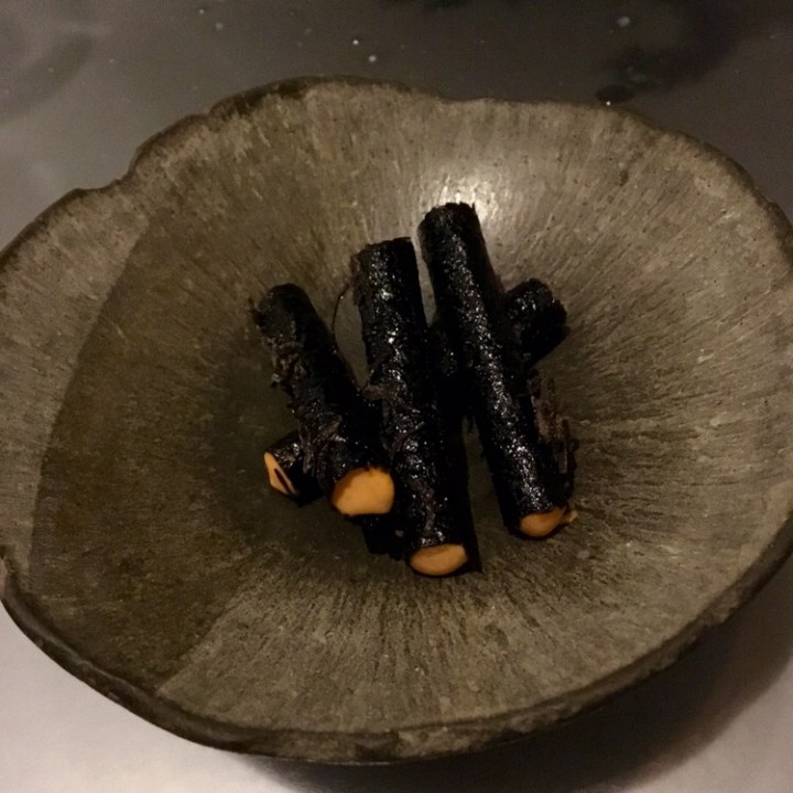 Our next course arrived with a white hot piece of Japanese coal (binchotan) over a slice of squab served with black rice and ashy-white black garlic. We also received a small spiral of chilled beet with mustard (not pictured).