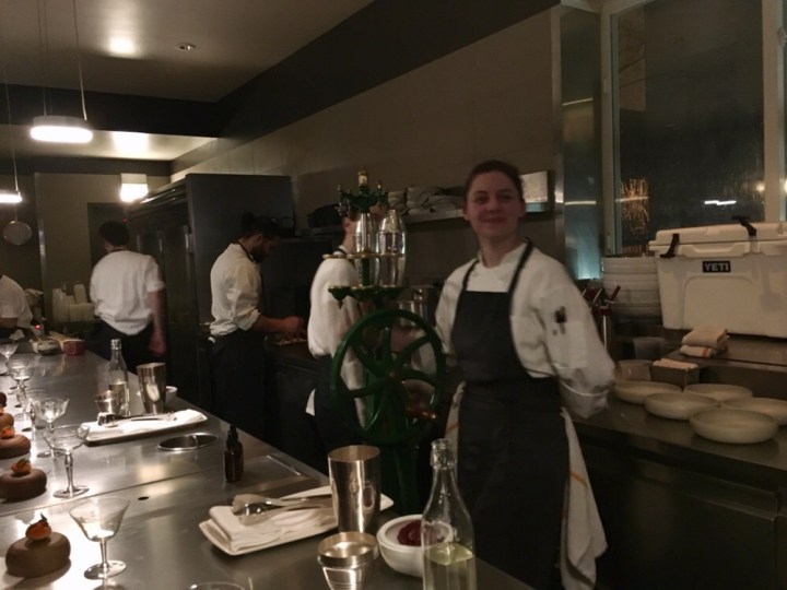 A sous chef introduced us to a special hand-cranked machine that shakes several metal cocktail shakers at one time – allowing her to make and pour cocktails for around 16 guests.