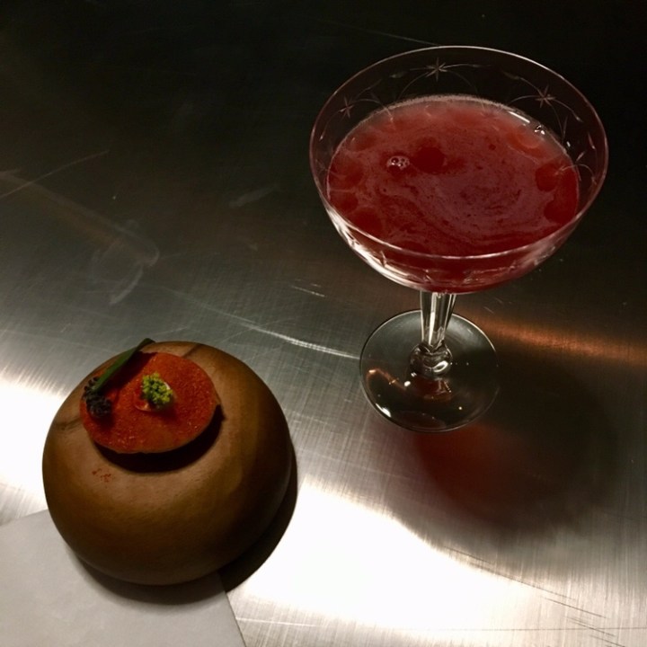 Our chef d’etage invited those of us dining from the Salon menu on the second floor to the kitchen downstairs for a special cocktail amuse-bouche. Incorporating a visit to the kitchen enhanced the dining experience and provided a welcomed opportunity to stretch and move about during a sedentary meal of multiple courses.
