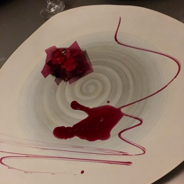 Back at our table, staff brought us small servings of Maitake mushrooms prepared in smoky lapsang souchong tea on a huge platter decorated with blueberry syrup and “glass.” We enjoyed glasses of Pinot Noir from Hanzell Estate Vineyard (Sonoma, California 2014).