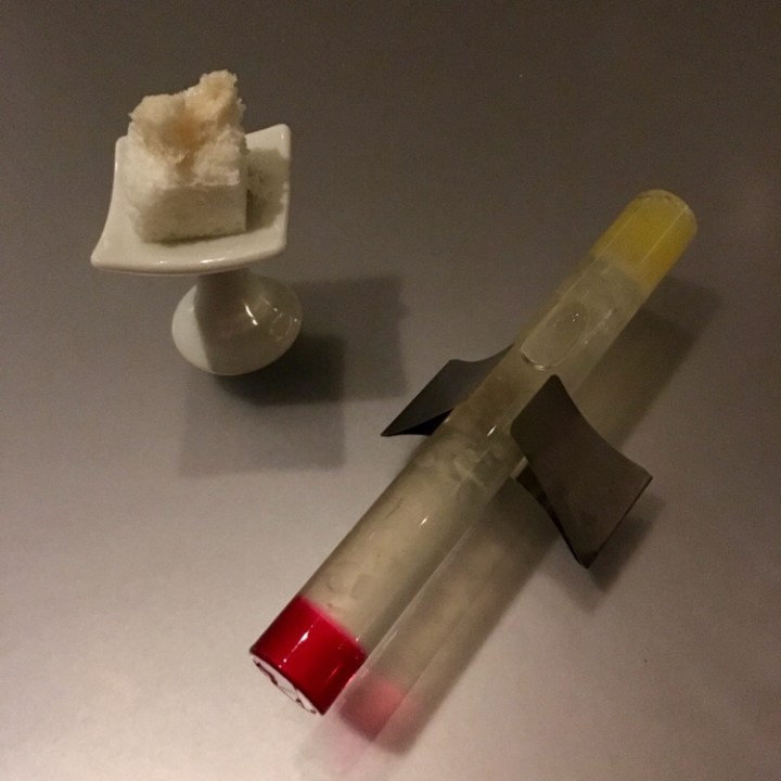 Dessert included an airy dry goat cheese cake topped with Mānuka, a mono-floral honey with a shot of shiso gelatin, aloe and pineapple drawn from a hollow glass tube.