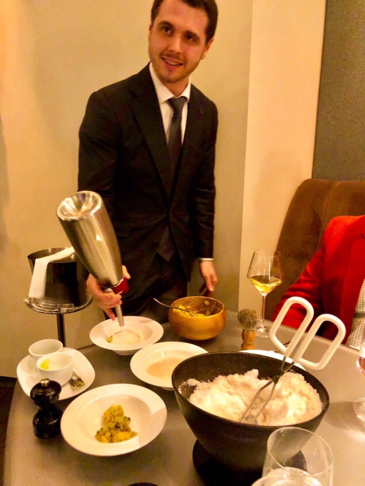 Staff prepared for the next course by bringing small bowls of celery, onion, and chopped bacon and a whipped cream dispenser filled with a creamy clam bisque. Using a pair of tongs, our chef d’étage removed a fully roasted potato hidden in the coarse salt of the bowl from our previous course. After brushing most of the excess salt away, he mashed the potato into a new bowl with the bacon, celery and onion and divided the mixture into four smaller bowls. He topped each bowl with a surge of whipped clam cream and served to each of us with hot sauce and house-made oyster crackers dusted with Old Bay spice. Robert proclaimed, “That’s a good CHOWdah!” as he sipped a delicious white burgundy with a name which escaped our notes.