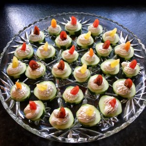 Beat the summer heat when you serve this cool canapé made with chilled cucumber at your next barbecue. Hot meats, burgers and hot dogs from the grill and heavy, carbohydrate-rich side dishes tend to dominate outdoor barbecues in the summer. This fresh vegetable treat can bring some balance to your next barbecue. A savory dollop of cream made with fresh dill and a quartered cherry tomato adds a burst of flavor to each slice of cucumber.