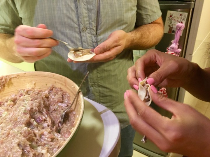 Vivian and her mother spread cling film onto a long, high countertop where we stood and made rows of dumplings. Our dumpling making reminded me of holiday stories shared by my husband’s Italian family where they would gather to make ravioli for Thanksgiving or Christmas. His large extended family spread bed sheets onto flat surfaces all over his great grandmother’s home – counters, tables, and beds – to make space for filled ravioli to dry until cooked for dinner on the same day. I marvel at the fact that cultures on opposite sides of a hemisphere with distinctive but similar foodways and traditions.