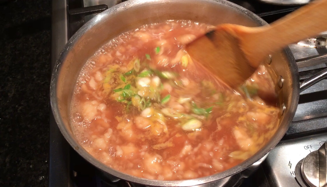 After the dough rested, I dumped the lumps into the boiling broth. After the dumplings cooked, I added a chopped scallion. A simple, savory meal.