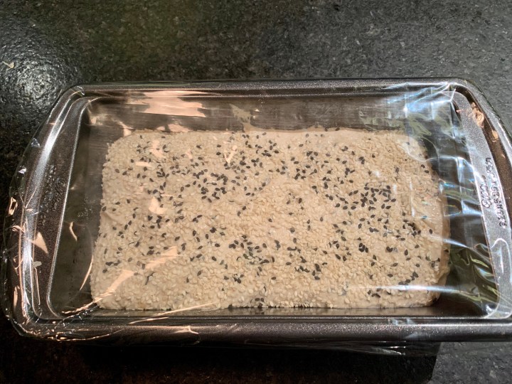- After the last folding, scrape from bowl onto a clean kitchen counter smeared with a thin film of olive oil. Use the dough scraper and your hands to spread the wet dough into an oblong shape. Use the scraper to loosen and lift one end from the counter and proceed to roll the dough toward the opposite end. Use the scraper to lift the loaf into the loaf pan with 1 tsp of olive oil in its base. Sprinkle remaining sesame seeds onto dough surface and place the covered dough in the refrigerator overnight to slow the yeast activity and build flavor.