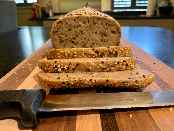 P.S. I tried a new pan with 8.5″ X 4.5″ X 2.75″ dimensions which produced a narrower and squarer sourdough loaf with better rise than the one above. I used the same recipe as above but without sesame seeds. Pleased with the results.