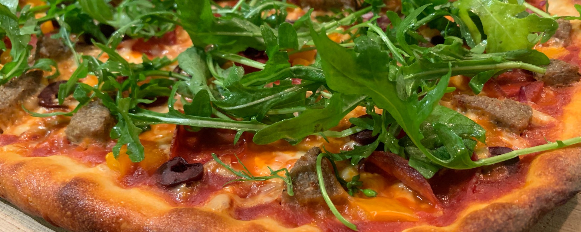 - Remove pizza on sheet with peel and transfer to a cutting board. Sprinkle arugula over pizza by hand and cut into 8 slices.