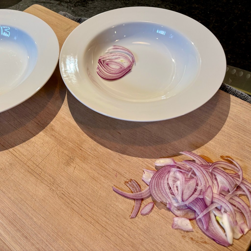 - 1/4 medium red onion shaved with a mandolin to 1/8”