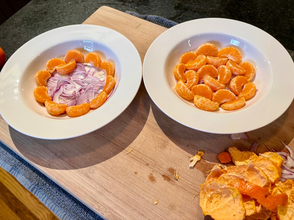 - Place a thin layer of shaved onion on two serving plates or bowls with a flat center. Add orange wedges on the outer edge over the onion and then fill toward the center.